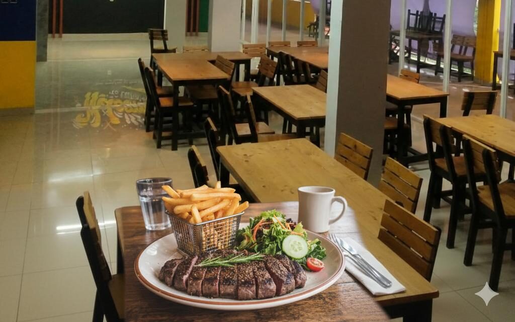Nikmati menu signature kami seperti Premium Grilled Steak dengan French fries dan salad segar, disajikan di interior modern-minimalis yang Instagram-worthy. Dengan meja kayu natural, lampu industrial